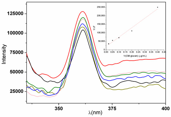where ΔF is the difference in fluorescence value at 361 nm in the presence or absence of CM-glucan increasing concentrations; ΔFmax is the maximal fluorescence intensity change; Ka is the binding constant; and (CM-glucan) is the polymer concentration. Double reciprocal linear plot of 1/ΔF and 1/(CM-glucan) according to the equation is given as inset in Figure 8. Ka binding constant can be calculated from the intercept and slope of the graph line.