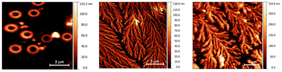 AFM has been previously used for characterizing compounds with a structure similar to CM-glucan, such as scleroglucan and different oat β-glucan isolates [44,45]. The other microscopy technique employed in this paper, SEM, is suitable to provide a rapid and direct high-resolution visualization of the sample’s morphology; moreover, if equipped with an Energy Dispersive X-Ray (EDX) spectrometer, it can provide a quantitative elemental composition map of the sample. This technique has been already employed in the study of both rod-like [44] and circular structures of different glucan derivatives, after a thermally induced denaturation and renaturation process. Hence, AFM and SEM can be combined together to achieve an in-depth characterization of the sample structures, in particular, to study highly structured surfaces such as those obtained by deposition of highly concentrate glucan solutions. Indeed, widely different morphological landscapes have been observed for highly concentrated solutions of a (1,3/1,6)-β-d-glucan extracted from yeast [46]. When air-dried films of this compound were created, the triple-helix, rod-like and circular structures were converted into macromolecular aggregates of different shapes, ranging from a branched tree-like structure to granules [40].