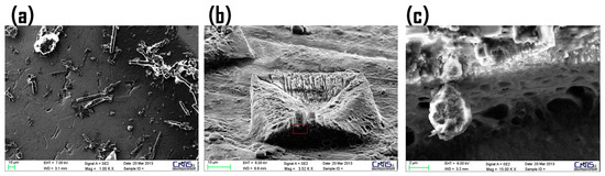 SEM images of: resveratrol/CM-glucan complex freshly prepared (a); after 12 months of storage at room temperature (b); and zoom of the aged sample (red rectangle) (c).