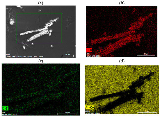 (a) SEM image; and (b–d) Microanalyses of carbon (red), oxygen (green) and aluminum (yellow), respectively, of CM-glucan/resveratrol (freshly prepared formulation).