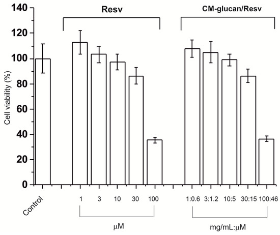 Viability of HaCaT cells line incubated for 48 h at 37 °C with resveratrol, CM-glucan, or the CM-glucan/Resv complex. Control is referred to the untreated cells and the error bars represent the standard deviation over three samples. Cell viability (%) values were normalized against the control.