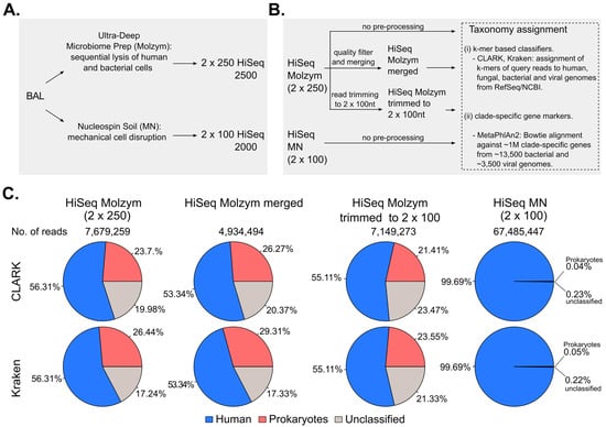 (A) Schematic representation of metagenomic sequencing: BAL was split into two aliquots which were independently treated with two DNA extraction protocols: Ultra-Deep Microbiome Prep (Molzym) and NucleoSpin Soil (MN). Metagenomic libraries were independently sequenced with 2 × 250 HiSeq 2500 and 2 × 100 Hiseq 2000, respectively; (B) Schematic representation of bioinformatics analyses: forward and reverse raw reads of Molzym- (HiSeq Molzym (2 × 250)) and MN-treated (HiSeq MN (2 × 100)) samples were used for taxonomic analysis with CLARK, Kraken and MetaPhlAn2. In addition, before taxonomic analyses, read pairs of the HiSeq Molzym (2 × 250) dataset were either quality-filtered and merged (HiSeq Molzym merged) or trimmed to the length of 100 nt (HiSeq Molzym trimmed to 2 × 100) as described in Materials and Methods; (C) Pie-charts representing the proportions (%) of sequencing reads classified as human (in blue), prokaryotic (red) or unclassified (grey) by CLARK (top row) and Kraken (bottom row). Proportions were computed over the total number of reads present in a given dataset. Viral- and fungal-classified read proportions are not shown and contributed to less 0.02% of total reads in all sequencing datasets.