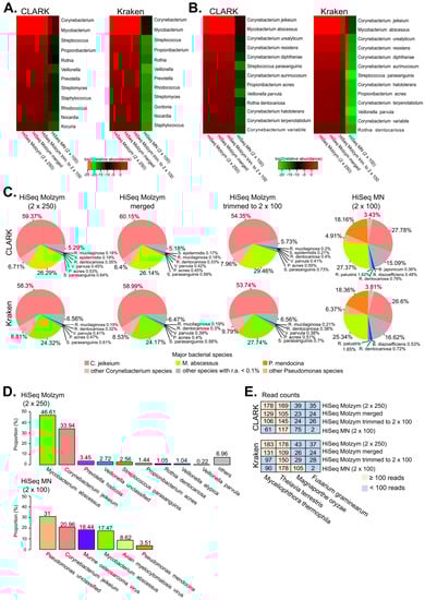 Although quality filtering would be a recommended step in the metagenomic analysis of clinical samples, trimming and quality filtering/merging of sequence data in the present study did not change the taxonomic profile of the enriched BAL sample much: the species identified by culture (C. jeikeium, M. abscessus and R. dentocariosa) were among the most abundant bacteria in both non-preprocessed and preprocessed datasets (Figure 2B,C).