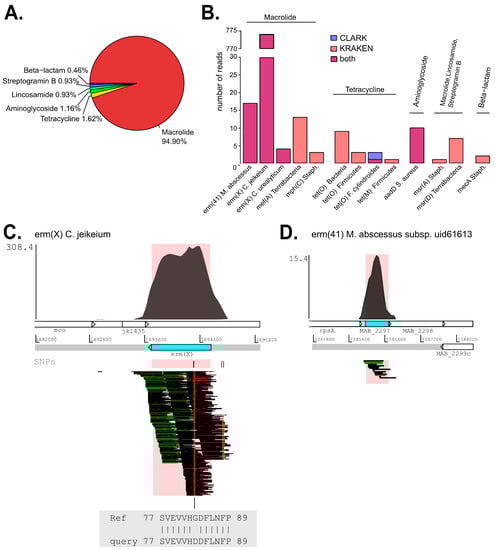 (A) Pie chart representing the relative abundance of the antibiotic resistance-determinant (ARD) classes in the metagenome of the enriched BAL sample after quality filtering and merging of sequencing reads. Relative abundance is expressed as percentage of total reads mapped to the ARD ResFinder database (847); (B) Barplot reporting the number of reads mapping to the identified ARDs. Colors indicate whether the taxonomic read assignment of an ARD to a given taxon was performed with CLARK (blue violet), with Kraken (coral) or confirmed by both (magenta). Reads that mapped to cfxA and cfxA2 genes remained unclassified; (C) Coverage plot of reads mapping to erm(X) locus on the C. jeikeium K411 genome. From top to bottom: density plot of read depth versus genome position; chromosomal position of the erm(X) gene; the open reading frame is colored in sky blue; position of three main single-nucleotide polymorphisms (SNPs) detected; schematic representation of mapped reads grouped in stacks; red dots and lines on stacks represent a nucleotide variant in a given read sequence; amino acid substitution in the ERM(X) protein. The pink-colored area defines the chromosomal landmarks of the gene in the density plot and in the representation of read mapping; (D) Coverage plot of reads mapping to the erm(41)-MAB_2297 locus on the M. abscessus ATCC 19977 genome. For further explanation, see panel (C). No single nucleotide variants were detected.