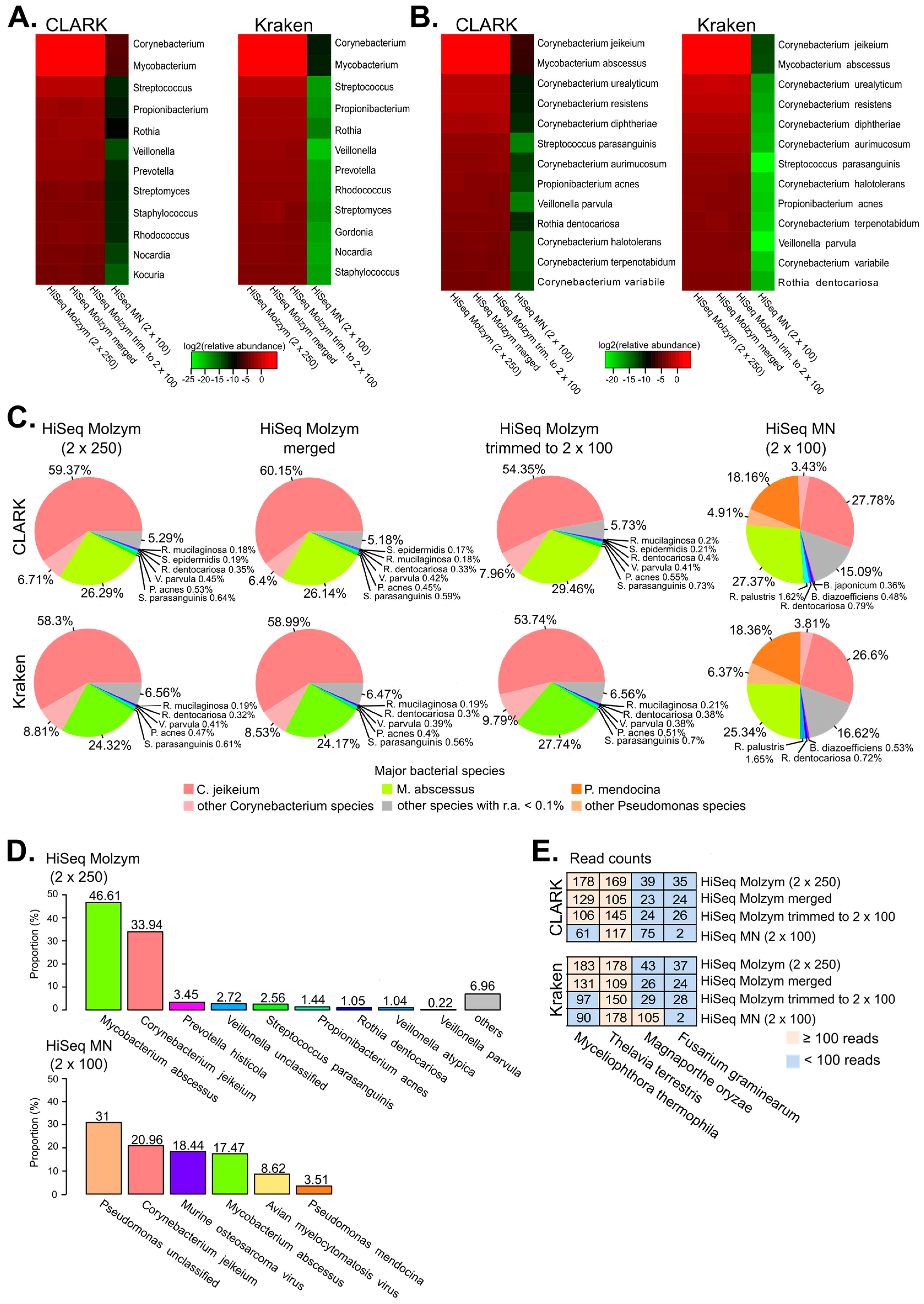 Heat maps reporting the log2-transformed relative abundance of the 15 most abundant bacterial genera (A) and the 16 most abundant bacterial species (B) identified by CLARK and Kraken in all sequencing datasets. Relative abundance, expressed in percentage, is computed on the number of reads assigned to a given genus or species divided by the total number of sequencing reads present in a given dataset; (C) Pie charts representing the bacterial proportions of identified species as performed by CLARK (top) and Kraken (bottom). Bacterial proportions are defined as the percentage of reads mapped to a given bacterial species over the total number of reads assigned to prokaryotes; (D) Barplots showing relative abundance (%) of bacterial and viral taxa identified by MetaPhlAn2 in HiSeq Molzym, and HiSeq MN sequencing data. Percentage values are reported at the top of each bar; (E) Heat map representing the number of reads assigned to the most abundant fungi. Numbers indicate read counts instead of proportions.