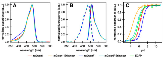 Absorption, excitation and emission spectra of rsGreens and Enhancer constructs. (A) Normalized absorbance spectra; (B) excitation (dashes) and emission (solid) spectra; (C) pH titration curves showing the absorption maximum at different pH values of the indicated labels. All graphs were normalized to their maximum absorption, excitation or emission. EGFP: enhanced green fluorescent protein; a.u.: arbitrary units.