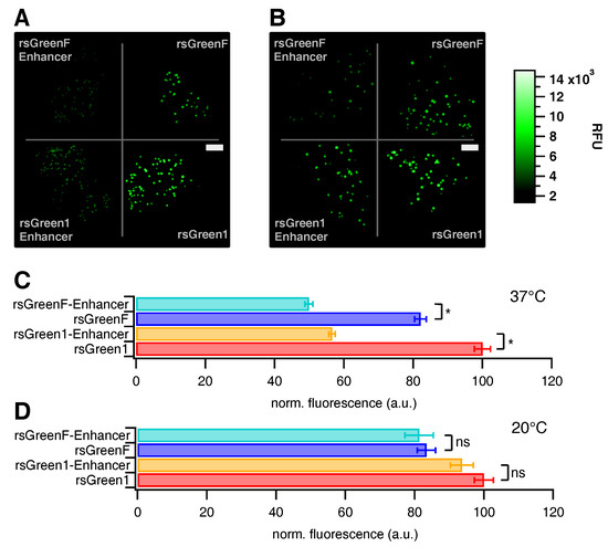 - Grotjohann, T.; Testa, I.; Reuss, M.; Brakemann, T.; Eggeling, C.; Hell, S.W.; Jakobs, S. rsEGFP2 enables fast RESOLFT nanoscopy of living cells. eLife 2012, 1, e00248. [Google Scholar] [CrossRef] [PubMed]
