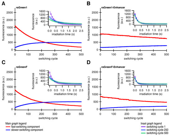 Global fits describing a two-species model for photoswitching in HeLa cells. Contribution of the two switching species of (A) rsGreen1, (B) rsGreen1-Enhancer, (C) rsGreenF, (D) rsGreenF-Enhancer and their respective fits (Appendix B). Red curves represent the fast-switching species A, blue curves the slower-switching species B. Inset: single off-switching decays and their respective fits for switching cycles 1 (purple), 250 (light blue) and 500 (green).