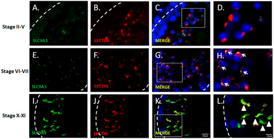 Expression patterns and localization of SLC9A3 during murine spermatogenesis. Top to bottom: Stages II–V (A–D); stages VI–VII (E–H); and stages X–XI (I–L) of spermatogenesis; (A,E,I) show the SLC9A3 signal (green); (B,F,J) show Lectin (red; acrosome marker); (C,G,K) merge from (A,B,E,F,I,J), respectively. The nucleus was stained using DAPI (blue). The enlarged Figure of (C,G,K) are shown in Figures (D,H,L), respectively. Arrows indicate the acrosomal vesicles. Arrowheads indicate the acrosome-covered regions of sperm heads. The scale bar is 20 μm in (K), and 10 μm in (L).