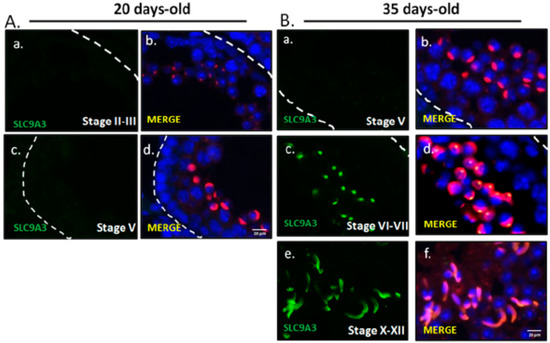 SLC9A3 starts to be expressed in 35 postnatal-day-old testes (A) Testicular sections prepared from 20-day-old mice. From top to bottom stages II–III (a,b) and stages V (c,d); (B) Testicular sections prepared from 35-day-old mice. From top to bottom: stages V (a,b), stages VI–VII (c,d), and stages X–XII (e,f). (A(a,c)) and (B(a,c,e)) indicated SLC9A3 signal (green). (A(b,d)) and (B(b,d,f)) indicated the merged figure with SLC9A3 signals (green), Lectin signals (red), and DAPI (blue). The scale bar is 20 μm in (A(d)) and (B(f)).