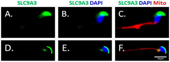 Expression patterns of SLC9A3 in elongating and elongated spermatids. Immunofluorescence detection of SLC9A3 in elongating spermatids (A–C) and elongated spermatids (D–F). (A,D) show SLC9A3 signals (green); (B,E) show SLC9A3 signals (green) and nucleus signals (blue); (C) is merged from (A,B), and MitoTracker signals (Mito; red); (F) is merged from (D,E), and MitoTracker signals (Mito; red). Scale bar = 10 μm.