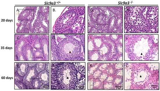 The testicular sections of 20-, 35-, and 60-day-old Slc9a3 knockout mice. Comparison of the testicular sections of WT (A–F) and Slc9a3−/− (G–L) mice according to H&E staining; (B,D,F,H,J,L) enlarged images from the areas boxed by a black dashed box in (A,C,E,G,I,K); Scale bar = 100 μm (E,K) and 50 μm (F,L); Elongated spermatids (arrowhead) observed in the ducts of the seminiferous tubules (D,F,J) but absent in (L).