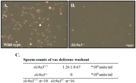 Sperm counts of vas deferens washout from Slc9a3 knockout mice. Sperm were isolated from the vas deferens of (A) wild-type and (B) Slc9a3 knockout mice. Arrowhead indicates mature sperm. Scale bar = 100 μm; (C) Sperm counts from Slc9a3+/+ (n = 10) and Slc9a3−/− (n = 16) mice.