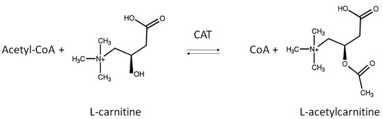 Figure 1. Biosynthesis of l-Acetylcarnitine. The acyl moiety is transferred from acetyl-CoA to the hydroxyl group of carnitine by the enzyme carnitine acetyltransferase (CAT).