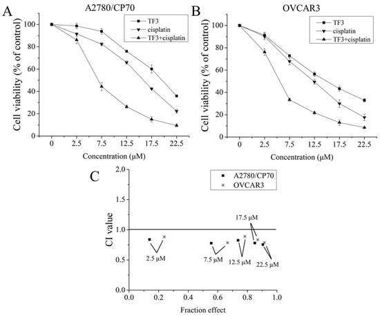 To determine the synergistic inhibitory effect of TF3 and cisplatin against ovarian cancer A2780/CP70 and OVCAR3 cells, we evaluated the combination index (CI) of TF3 and cisplatin at a constant ratio of 1:1 (μM:μM). The viability of both cells treated with TF3, cisplatin, and their combination was determined using the MTS assay. As shown in Figure 1A,B, TF3, cisplatin, and the combination treatment decreased the viability of both cells in a dose-dependent manner. CI values were calculated using CalcuSyn software. As shown in Figure 1C, the CI values of combination treatment at the designated concentration were less than 1.0, which indicated that the inhibitory effect of TF3 and cisplatin combination treatment against ovarian cancer cells was synergistic.