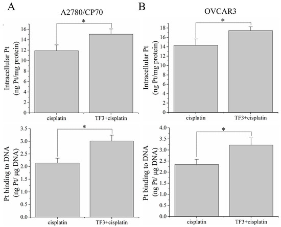 Effects of TF3 on the accumulation of Pt and DNA-Pt adducts in A2780/CP70 and OVCAR3 cells. Cells were treated with 7.5 μM cisplatin or 7.5 μM combined TF3 and cisplatin for 6 h followed by the ICP-MC assay. (A) Effects of TF3 on the accumulation of Pt and DNA-Pt adducts in A2780/CP70 cells; (B) effects of TF3 on the accumulation of Pt and DNA-Pt adducts in OVCAR3 cells. Data represent means ± SD of three independent experiments. Significant differences among different treatments are marked with * (p < 0.05).