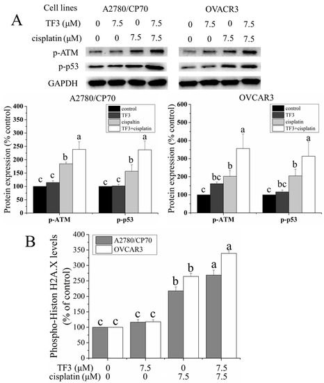 Treatment with 7.5 μM TF3 enhanced DNA damage induced by 7.5 μM cisplatin in ovarian cancer A2780/CP70 and OVCAR3 cells. (A) The effect of TF3, cisplatin and combination treatment of the protein levels of p-ATM and p-p53 in ovarian cancer cells were determined by Western blot analysis; (B) the effect of TF3, cisplatin and combination treatment of the protein level of p-Histon H2A.X in ovarian cancer cells was determined by ELISA assay. Results are expressed as mean ± SD from three independent experiments. Significant differences among different treatments are marked with different letters (p < 0.05).