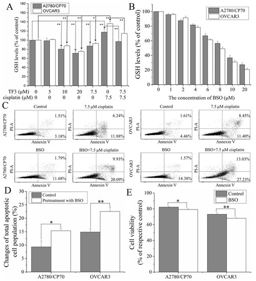 Treatment with TF3 potentiated inhibitory effect of cisplatin against ovarian cancer A2780/CP70 and OVCAR3 cells via reducing GSH levels. (A) The effect of TF3, cisplatin, or combination treatment on the GSH levels in ovarian cancer cells. The statistical difference analysis was performed between the groups at both ends of the broken lines with arrows; (B) treatment with BSO decreased the GSH levels in ovarian cancer cells in a dose-dependent manner.; (C) pretreatment with 2.0 μM BSO enhanced the pro-apoptotic effect of 7.5 μM cisplatin on ovarian cancer cells; (D) the changes of total apoptotic cell population induced by 7.5 μM cisplatin in control cells and cells pretreated with 2.0 μM BSO were expressed as quantification histograms with error bars; (E) pretreatment with 2.0 μM BSO enhanced the inhibitory effect of 7.5 μM cisplatin on the viability of ovarian cancer cells. Results are expressed as mean ± SD from three independent experiments. Significant differences among different treatments are marked with * (p < 0.05) and ** (p < 0.01).
