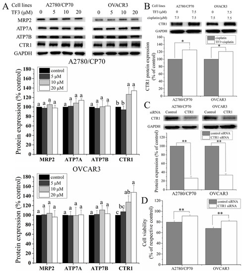 Human ovarian cancer cell lines A2780/CP70 and OVCAR3 were obtained from Βing-Hua Jiang at West Virginia University. The cells were cultured in RPMI-1640 medium (Sigma, St Louis, MO, USA) supplemented with 10% fetal bovine serum (Invitrogen, Rockford, IL, USA), 1% penicillin (100 U/mL), streptomycin (10 μg/mL), and amphotericin-B (250 μg/mL) (Sigma, St Louis, MO, USA) at 37 °C with 5% CO2 in a humidified incubator. TF3 monomers were isolated and purified using a previously established method [39]. Cisplatin was purchased from Sigma-Aldrich (Sigma, St Louis, MO, USA). TF3 and cisplatin were prepared in distilled water and stored at −20 °C. CTR1 siRNA and control siRNA were purchased from Santa Cruz Biotechnology (Danvers, MA, USA).