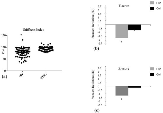 - Brown, T.T.; Ruppe, M.D.; Kassner, R.; Kumar, P.; Kehoe, T.; Dobs, A.S.; Timpone, J. Reduced bone mineral density in human immunodeficiency virus-infected patients and its association with increased central adiposity and postload hyperglycemia. J. Clin. Endocrinol. Metab. 2004, 89, 1200–1206. [Google Scholar] [CrossRef] [PubMed]