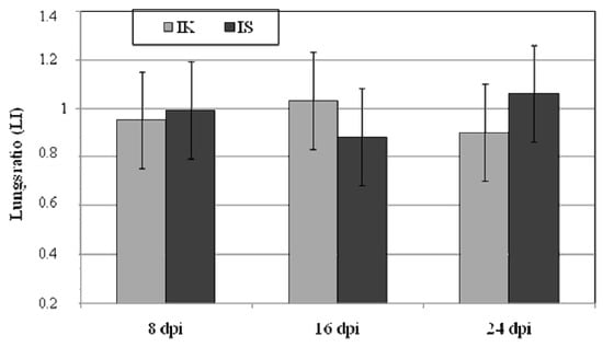 The relative weight ratio of lungs (LI) in relation to control groups: immunocompetent (IK) and immunosuppressed (IS) in various (8, 16, 24) days post Acanthamoeba sp. infection (dpi). Data represent the mean ± standard deviation (SD).