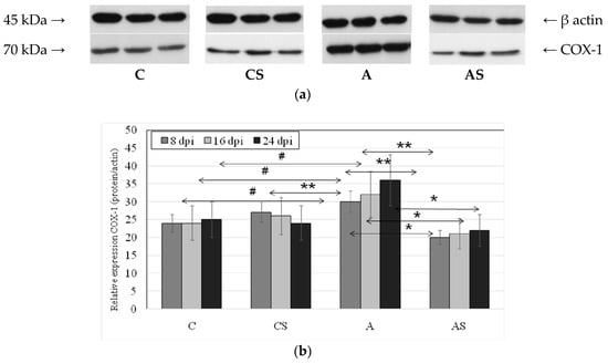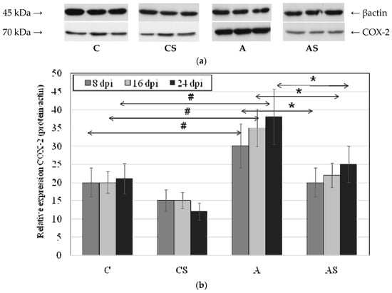 In the Acanthamoeba sp.-infected immunocompetent mice the expression of COX-2 protein was significantly higher than in the control group at 8 dpi (by 50%, p = 0.002), 16 dpi (by 75%, p = 0.001) and 24 dpi (by 80%, p = 0.003). There was an upward trend in the expression of the enzyme in relation to the duration of infection, but the observed differences were not statistically significant. COX-2 expression was different in Acanthamoeba sp.-infected immunocompetent mice and was significantly higher than in Acanthamoeba sp.-infected immunosuppressed mice (Figure 3). The highest expression of the enzyme was observed in A group at 24 dpi, 52% higher (p = 0.003) vs. AS group. Also at 8 dpi COX-2 expression was 50% higher (p = 0.001) and at 16 dpi was significantly higher (by 59%, p = 0.004) compared to Acanthamoeba sp.-infected immunosuppressed mice.