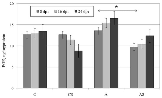 We did not observe statistically significant differences in lung PGE2 concentration between the immunocompetent control group and Acanthamoeba sp.-infected immunocompetent mice (Figure 4). Lung PGE2 was the highest at 24 dpi in Acanthamoeba sp.-infected animals and almost 19% higher than in the uninfected control mice. In A group we observed an increase PGE2 concentration progressing with the duration of infection, but it was not statistically significant. There were also no statistically differences in lung PGE2 concentrations between AS and CS groups. We observed higher levels of lung PGE2 in mice from A group in comparison to mice from AS group at 8 dpi (p = 0.04).