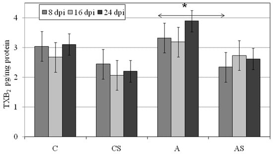 Changes in the levels of thromboxane B2 (TXB2) in the lungs of Acanthamoeba sp.-infected mice depending on the host immune status (C, immunocompetent uninfected control group mice; CS, immunosuppressed uninfected mice; A, immunocompetent Acanthamoeba sp.-infected mice; AS, immunosuppressed Acanthamoeba sp.-infected mice; dpi days post infection); Data represent the ± standard deviation (SD) for six in dependent experiments * p ≤ 0.05 for the significance of difference A vs. AS (Mann–Whitney U test).