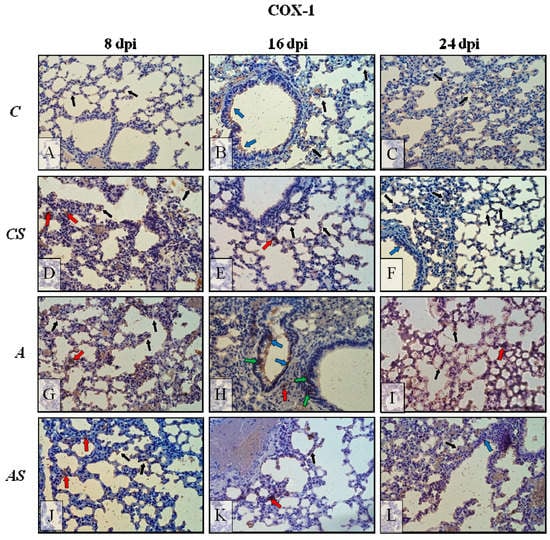 Representative microphotography showing immunoexpression (brown color) of COX-1 in mice lungs from control group (A–C), control drug treated group: CS (D–F), infected by Acanthamoeba sp. (G–I) and treated by drug during infection groups (J–L) in 8, 16 and 24 days post infection (dpi). The examples of immunopositive cells: epithelial cells of bronchioles, blue arrows; pneumocytes, black arrows; stromal cells, stromal cells of lung parenchyma—red arrows, intraepithelial lymphocytes—green arrows ×40. (C, immunocompetent uninfected control group mice; CS, immunosuppressed uninfected mice; A, immunocompetent Acanthamoeba sp.-infected mice; AS, immunosuppressed Acanthamoeba sp.-infected mice; dpi, days post infection).