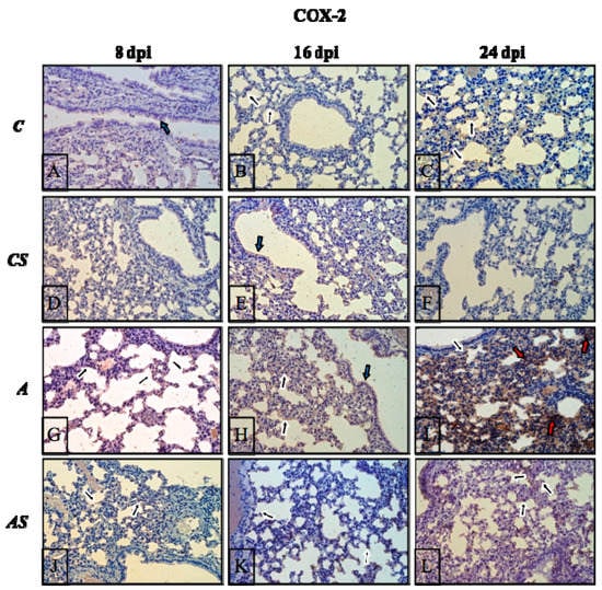 In both uninfected groups (C, CS), the immunoexpression of COX-2 was very low at almost imperceptible levels (Figure 7A–F). Among the COX-2-positive cells were pneumocytes and epithelial cells (their apical part/cilia) of bronchioles (black and blue arrows). Decisive elevations in COX-2 level were observed in the lungs of the infected groups of mice (Figure 7G–I), wherethe highest expression of this isoform of cyclooxygenase was noted at 24 dpi (Figure 7I); where besides pneumocytes (black arrows) or poorly positive bronchial epithelial cells (blue arrows), strong immunopositive levels were also noted in parenchyma cells (red arrows). The drug treatment resulted in a decrease of immunoreactivity of lung tissue (especially at 8 dpi) (Figure 7J), after that, it started to increase again (Figure 7K,L), but nevertheless, was at a lower level than in the infected immunocompetent animals (Figure 7G–I); among the mice of group (AS), the presence of COX-2 was noted most of all in the epithelial cells of alveoli (black arrows).
