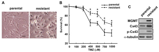 Effects of TMZ treatment on MGMT and Cx43 expression in GBM. Human U251 glioma cells were treated with TMZ or non-treated to induce TMZ-resistant U251 cells and parental U251 cells, respectively. (A) The TMZ-resistant cells and the parental cells have a distinctive morphology. Scale bar = 20 μM. (B) Determination of the TMZ (0–1000 µM, for 72 h)-induced cell death in parental U251 cells and TMZ-resistant U251 cells. Analyzed by SRB assay for cell viability. Quantitative data are presented as mean ± SEM of three independent experiments. * p < 0.05 compared with the parental group; (C) MGMT, Cx43, and p-Cx43 expression were determined using Western blot analysis in parental and TMZ-resistant cells.