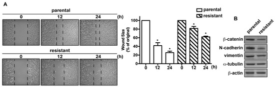 TMZ-resistant cells exhibited lower migratory ability than parental glioma cells. (A) After the TMZ selection, the parental U251 and their corresponding TMZ-resistant subline were seeded for indicated time periods (0, 12, and 24 h). Cell migration was determined using a wound-healing assay. TMZ-resistant cells exhibited decreased migration ability compared with parental cells. Representative images are shown. Quantitative data are presented as mean ± SEM of three independent experiments. * p < 0.05 compared with the control group. (B) The protein expression profiles of the U251 and the TMZ-resistant cells. Protein expression levels of EMT-associated markers were determined using Western blotting.