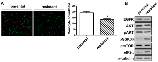 Several studies reported that the monocytes/macrophages are the major glioma-associated inflammatory cells that constituted the tumor microenvironment [31]. Importantly, a recent report and a clinical study revealed that those monocytes/macrophages are the most predominant tumor-associated macrophages (TAMs) in GBM [32,33]. It has been indicated that suppressing the tumor-promoting effects of monocytes in glioma could be considered as an adjuvant treatment [34]. The ability of monocytes binding to GBM was determined by the monocyte-binding assay. We compared the monocyte adhesion ability between the TMZ-resistant subline and the parental cells, and it revealed that the TMZ-resistant subline exhibited reduced monocyte adhesion compared with the parental cells (Figure 3A). The binding of epidermal growth factor (EGF) to its receptor (EGFR) activates several signaling intermediates, including AKT, leading to control of cell survival and metabolism [35]. We further investigated the expression levels of proliferation-associated molecules and found that the expressions of EGFR and AKT were decreased in TMZ-resistant cells (Figure 3B). In addition, it has been reported that the activation of AKT leads to activate kinases and inhibit GSK3 by phosphorylating the inhibitory serines on GSK3 in resting cells [36]. The phosphorylation level of GSK3β can be enhanced by the activation of eIF2α kinases [37]. According to our data, elevated levels of phosphorylated GSK3β and eIF2α expression were observed in TMZ-resistant cells (Figure 3B).
