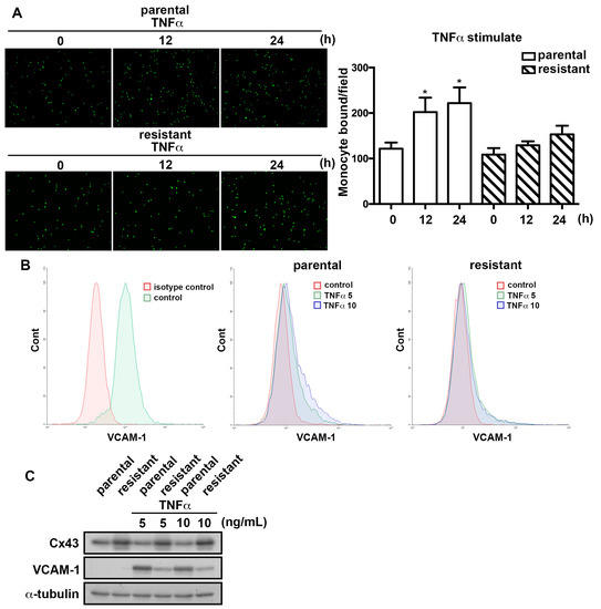 TMZ-resistant cells exhibited a lower sensitivity to TNF-α-induced VCAM-1 expression. (A) Parental U251 and TMZ-resistant cells were treated with TNF-α (10 ng/mL) for indicated time periods (0, 12, 24 h) followed by incubation with BCECF-AM-labeled-THP-1 for 30 min. The monocyte-binding ability was examined by the fluorescence microscopy and the one-way ANOVA analysis of variance was performed. The data are presented as mean ± SEM of three independent experiments. * p < 0.05 compared with the control group. (B) U251 and TMZ-resistant cells were treated with various concentrations of TNF-α (5 or 10 ng/mL) for 24 h and the expression of cell surface VCAM-1 was determined by using flow cytometry. (C) Cells were treated with various concentrations (5 or 10 ng/mL) of TNF-α for 24 h. VCAM-1 and Cx43 expressions were determined using Western blot analysis.