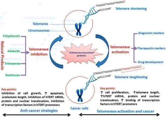 Telomerase is generally observed in most cancer cells and is critical for cancer cell development []. Hence, the deactivation or inhibition of telomerase is essential in the cancer-suppressive mechanism. The deactivation of telomerase and destabilization of telomere by natural/synthetic products provides extensive opportunity to succeed new targets for cancer therapy. Nowadays, several synthetic compounds are commercially used for chemotherapy of cancer. However, most have many side-effects or complications in the cancer patients. Hence, it is very important to explore the beneficial effects of natural products such as medicinal plants on the various cancer cells and potential anti-cancer therapeutic effects []. Moreover, natural products are normally taken in the human diet as the traditional medicine that are edible, safe to consume and have higher acceptability among the individuals []. Besides that, natural products reduce/inhibit the telomerase activity that can be utilized as functional food by the cancer individual for healing or treatment. Thus, this review puts forward the use of natural products that inhibit the telomerase as a phytomedicine in cancer prevention, which can be noted as a direction for future research on targets for cancer therapy (Figure 1). Furthermore, this review aims to provide fundamental knowledge for research on the telomerase structure, functions, working regulation of telomerase and its various binding proteins to inhibit the telomere/telomerase complex. In addition, the review summarizes the inhibitors of the enzyme catalytic subunit and RNA component, natural products that target telomeres and suppression of transcriptional and post-transcriptional levels.