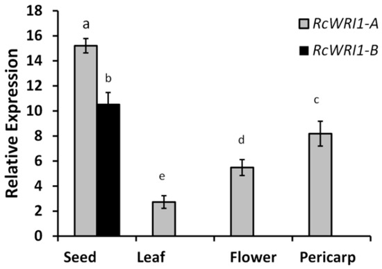 Expression of RcWRI1-A and RcWRI1-B in major castor bean organs. Expression profiles were determined by qRT-PCR using total RNA from leaves, flowers, pericarps, and developing seeds. RcActin was used as an internal control. Each value is the mean ± SD of six biological replicates. Letters a, b, c, d, e indicate significant differences at the level of p < 0.05 according to the Tukey’s test.