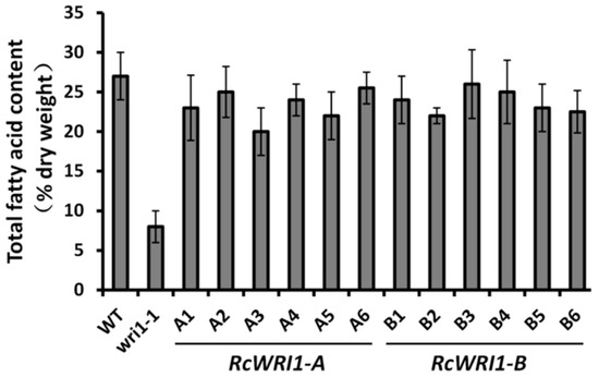 In order to investigate the function of the RcWRI1s, we separately overexpressed RcWRI1-A and RcWRI1-B under a seed-specific Gly promoter in the Arabidopsis wri1-1 loss-of-function mutant. A microscopic observation of mature dry seeds showed that transgenic wri1-1 plants expressing RcWRI1-A or RcWRI1-B displayed a non-wrinkled phenotype (Figure 4). We further measured the fatty acid content in seeds of transgenic lines. Overexpression of RcWRI1-A or RcWRI1-B restored total fatty acid content in seeds to the wild-type level (Figure 5).