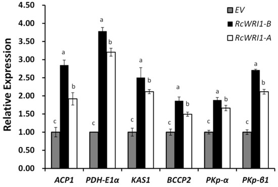 To investigate the function of RcWRI1-A and RcWRI1-B in gene regulation, we further examined the expressions of the putative target genes in N. benthamiana leaves where RcWRI1-A or RcWRI1-B were transiently expressed (Figure S3B). These putative target genes include plastid pyruvate kinase beta subunit 1 (PKp-β1), pyruvate kinase alpha subunit (PKp-α), acyl carrier protein 1 (ACP1), pyruvate dehydrogenase E1 component alpha subunit (PDH-E1α), biotin carboxyl carrier protein isoform 2 (BCCP2), and 3-ketoacyl-acyl carrier protein synthase 1 (KAS1) [14,15]. qRT-PCR analysis revealed that expression of these target genes was significantly increased in leaves either expressing RcWRI1-A or RcWRI1-B relative to the empty-vector (EV) controls (Figure 6). Notably, expression of PDH-E1α was three times higher than in the control. Moreover, RcWRI1-B appeared to show a stronger activity in promoting the target gene expression than RcWRI1-A.