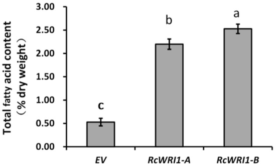 Fatty acid profiles in N. benthamiana leaves expressing each of RcWRI1s. Fatty acids were extracted from the leaf samples and then transmethylated, followed by gas chromatography analysis. Fatty acid content was expressed as the percentage of leaf dry weight. EV indicates empty-vector control. Each value is the mean ± SE of twelve biological replicates. Letters a, b indicate significant differences at the level p < 0.05 according to the Tukey’s test.