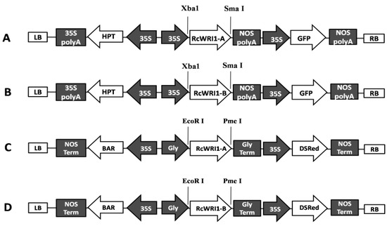 The ORFs of RcWRI1-A and RcWRI1-B were separately amplified from their corresponding clone vectors using gene-specific primers with Xbal (5′-end) and SmaI (3′-end) sites (RcWRI1-F2: 5′-GCTCTAGAATGAAGAGGTCTCCTACTTCC-3′ and RcWRI1-R2: 5′-TCCCCCGGGTCAAACA GAATAGTTACAAC-3′). RcWRI1-A and RcWRI1-B ORFs were then respectively inserted behind the CaMV 35S promoter in the pCAMBIA1303 vector (Figure 9). This vector contains a reporter gene GFP driven by the CaMV35S promoter, which facilitates the identification of transgenic events in transformation of Nicotiana benthamiana. For transformation of Arabidopsis, the ORFs of RcWRI1 were amplified from clone vectors using primers containing EcoRI and PmeI sites (RcWRI1-F3: 5′-CGGAATTCATGAAGAGGTCTCCTACTTCC-3′ and RcWRI1-R3: 5′-GGGTTTAAACTCAAA CAGAATAGTTACAAC-3′). RcWRI1s was then transferred into the pJC-Gly-DsRED binary vector under the control of the seed-specific Gly-promoter and with the DsRed selection marker. These vectors containing RcWRI1-A or RcWRI1-B were then transformed into Agrobacterium tumefaciens GV3101 by the freeze-thaw method, which were used for Arabidopsis plant transformation.