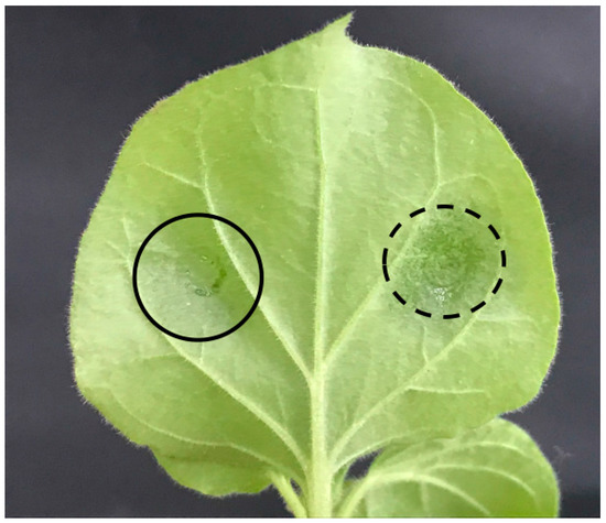 Tobacco leaf image showing the regions infiltrated by the Agrobacterium. The left-half part of the leaf was infiltrated with Agrobacterium containing the RcWRI1 expression vector, while the right-half part of the leaf was infected by Agrobacterium containing an empty vector. The solid black circle shows the region infiltrated by the target gene, and dotted black circle marks the region infected by the empty-vector control.