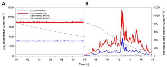 Changes in measured CO2 concentration in the closed chamber and intercepted light intensity at the top, middle and bottom of the mango tree on 15 July 2016 under artificial light (A) and 21 July 2016 under natural light (B) for 12 h.