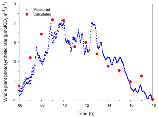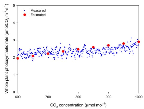 Simulation results showed that the whole plant photosynthetic rate increases in the form of a saturation curve with increasing CO2 concentration under the artificial light. This occurs because the increase in whole plant photosynthetic rate by CO2 concentration followed the increase in leaf photosynthetic rate even though the light intensity at each leaf is different. However, the measured whole plant photosynthetic rate did not appear as a saturation curve (Figure 2). In order to measure the whole plant photosynthetic rate under the artificial light, we measured the change in CO2 concentration in the chamber for 12 h (Figure 1A). In this case, the CO2 concentration was between 700 and 1000 μmol·mol−1 during the nighttime from 19:00 to 05:00. The crop adapts according to the photoperiod and performs photosynthesis in the daytime and translocation action to move assimilation products in the daytime or respiration at night [29]. Therefore, the measured whole plant photosynthetic rate at night may differ from the actual value.