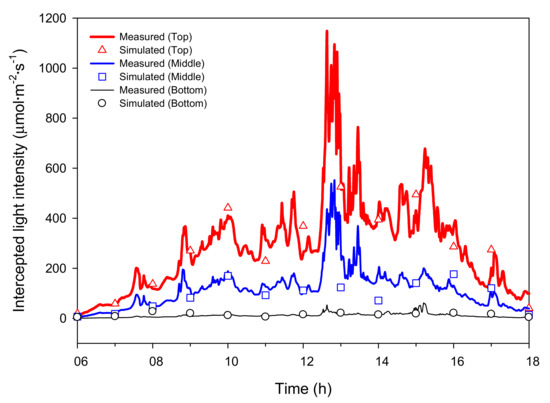 Comparison of measured and simulated intercepted light intensity at the top, middle, and bottom of the mango tree under natural light on 21 July 2016.