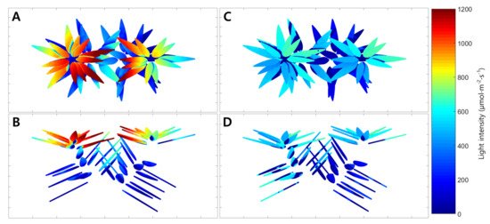Estimated spatial distributions of light interceptions of the mango tree under artificial light ((A), top view; (B), front view) and under natural light on 21 July 2016 ((C), top view; (D), front view).