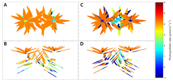 Similarly, the simulated intercepted light intensities at the top, middle, and bottom of the plant under natural light fluctuated like the actual measurements (Figure 3). At 06:00, the intercepted light intensities at the leaves in the top, middle, and bottom began at 0 μmol·m−2·s−1, but differences among the positions appeared as time passed. At all positions, the maximum values of the simulated intercepted light intensity were observed at 13:00, and the changing tendency in intercepted light intensity was similar to that measured. Using the 3D plant model, the distribution of the intercepted light intensity under natural light was expressed in 3D space at 12:00 on 21 July 2016 (Figure 5C,D). The maximum intercepted light intensities at the top and bottom leaves were 600 and near 0 μmol·m−2·s−1, respectively. The distribution of the whole plant photosynthetic rate under the natural light at 12:00 on 21 July 2016 was expressed in 3D space using the simulated intercepted light intensity, measured CO2 concentration, and leaf photosynthetic rate model (Figure 6C,D). In most of the top leaves, the photosynthetic rate was 4 μmolCO2·m−2·s−1, and these leaves showed the intercepted light intensity exceeded the saturation point. However, unlike under the artificial light, discontinuous sections were observed where the photosynthetic rate was 0 μmolCO2·m−2·s−1 at the middle and bottom leaves. In order to compare with the actual results, whole plant photosynthetic rates were calculated at one hour intervals on 21 July 2016 using the simulated intercepted light intensities, CO2 concentrations inside the chamber, and the leaf photosynthetic rate model (Figure 4). The whole plant photosynthetic rate started at 0.2 μmolCO2·m−2·s−1 at 06:00, reached the maximum value of 7.3 μmolCO2·m−2·s−1 at 09:00, and then gradually decreased to −1.0 μmolCO2·m−2·s−1 at 18:00.