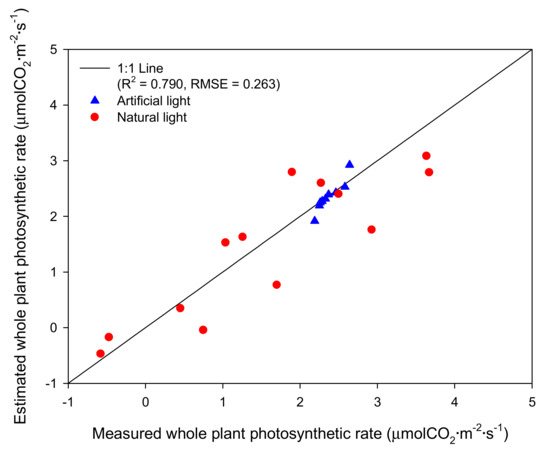 The results of validation of the measured and estimated whole plant photosynthesis rates showed that both artificial light and natural light conditions showed linear relationships (Figure 7). The coefficient of determination (R2) and root mean square error (RMSE) were 0.728 and 0.020 under the artificial light and were 0.715 and 0.447 under the natural light, respectively. At combined light conditions, R2 was 0.790 and RMSE was 0.263.