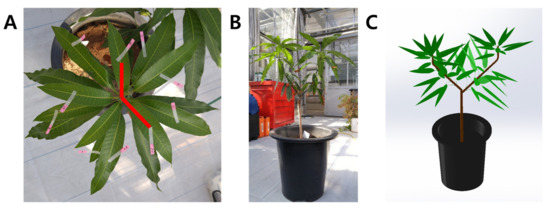 A 3D plant model was constructed in the same shape as the mango tree to measure the photosynthetic rate. Considerations before making the 3D plant model were as follows: (i) Leaf area and petiole length; (ii) phyllotaxis of the leaves; and (iii) branch pattern, stem length, and diameter. Since the mango leaves used in the experiment cannot be destroyed, leaf area (LA) was calculated using a model consisting of leaf length (L) and width (W): LA = −14.623 + 8.074W + 0.085L2 + 0.452W2 (R2 = 0.971) [40]. The leaf length, leaf width, and petiole length were measured for all leaves using a ruler. The total LA of the mango used in the experiment was 4194.84 cm2. To determine the phyllotaxis of the mango leaves, photographs were taken vertically at the apex of the stem and the angle between leaves were measured (Figure 8A and Table 1). In order to create a 3D plant model, the leaves were arranged in the same order as verticillation using the average angle shown in Table 1. The shape of a two-year-old mango branch had a simple form with a new branch growing at the tip of the main stem in a large Y-shape. The stem length, stem diameter, and number of leaves attached to each branch were reflected in the model. The 3D plant model was constructed using measured leaf length and width, phyllotaxis, branch pattern, stem length, and stem diameter. The 3D plant model was developed using 3D CAD software (SolidWorks, Dassault Systemes, Velizy-Villacoublay, France).