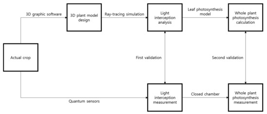The validation process was performed in two steps. First, the measured light interception at each position in the mango was compared with the estimated interception. Unlike artificial light, natural light intensity changes with time; therefore, the simulated estimated light intensities were compared with the measured intensities with time. Secondly, the measured whole plant photosynthetic rate in the closed chamber was compared with the calculated one using the leaf photosynthetic rate model and simulated intercepted light intensity. A workflow for the construction of the 3D plant model, calculation, and validation of the whole plant photosynthetic rate is described in Figure 10.