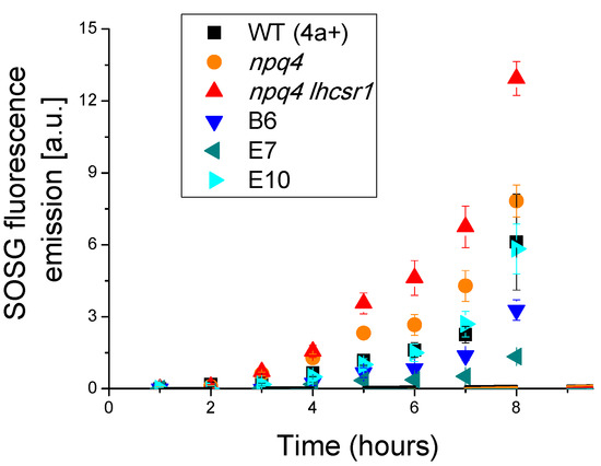 - Flors, C.; Fryer, M.J.; Waring, J.; Reeder, B.; Bechtold, U.; Mullineaux, P.M.; Nonell, S.; Wilson, M.T.; Baker, N.R. Imaging the production of singlet oxygen in vivo using a new fluorescent sensor, Singlet Oxygen Sensor Green. J. Exp. Bot. 2006, 57, 1725–1734. [Google Scholar] [CrossRef] [PubMed]